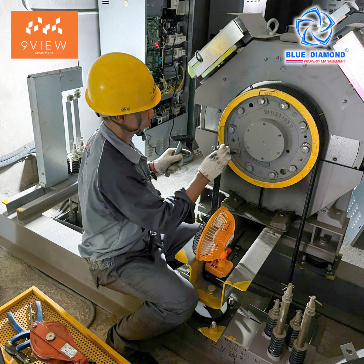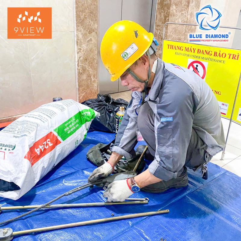 Đội ngũ kỹ thuật (Công ty CP Kim Cương Xanh) phối hợp với đơn vị dịch vụ nhanh chóng khắc phục các thiết bị thang máy quan trọng nhằm kịp thời phục vụ cư dân di chuyển thuận tiện, liên tục.